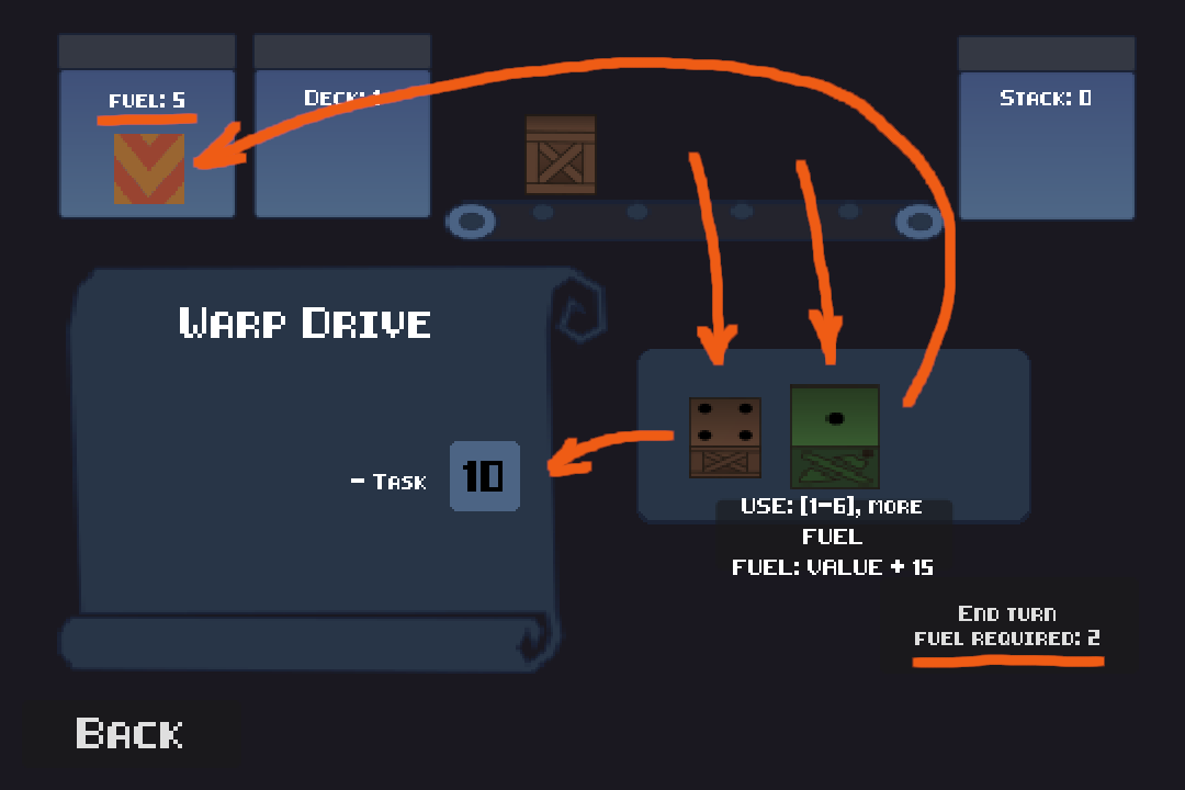 Drag the die to the table. After building a combination, drag it to the task. You need fuel. Scrap some dice carefully. Scraped dice do not return to the deck. End turn